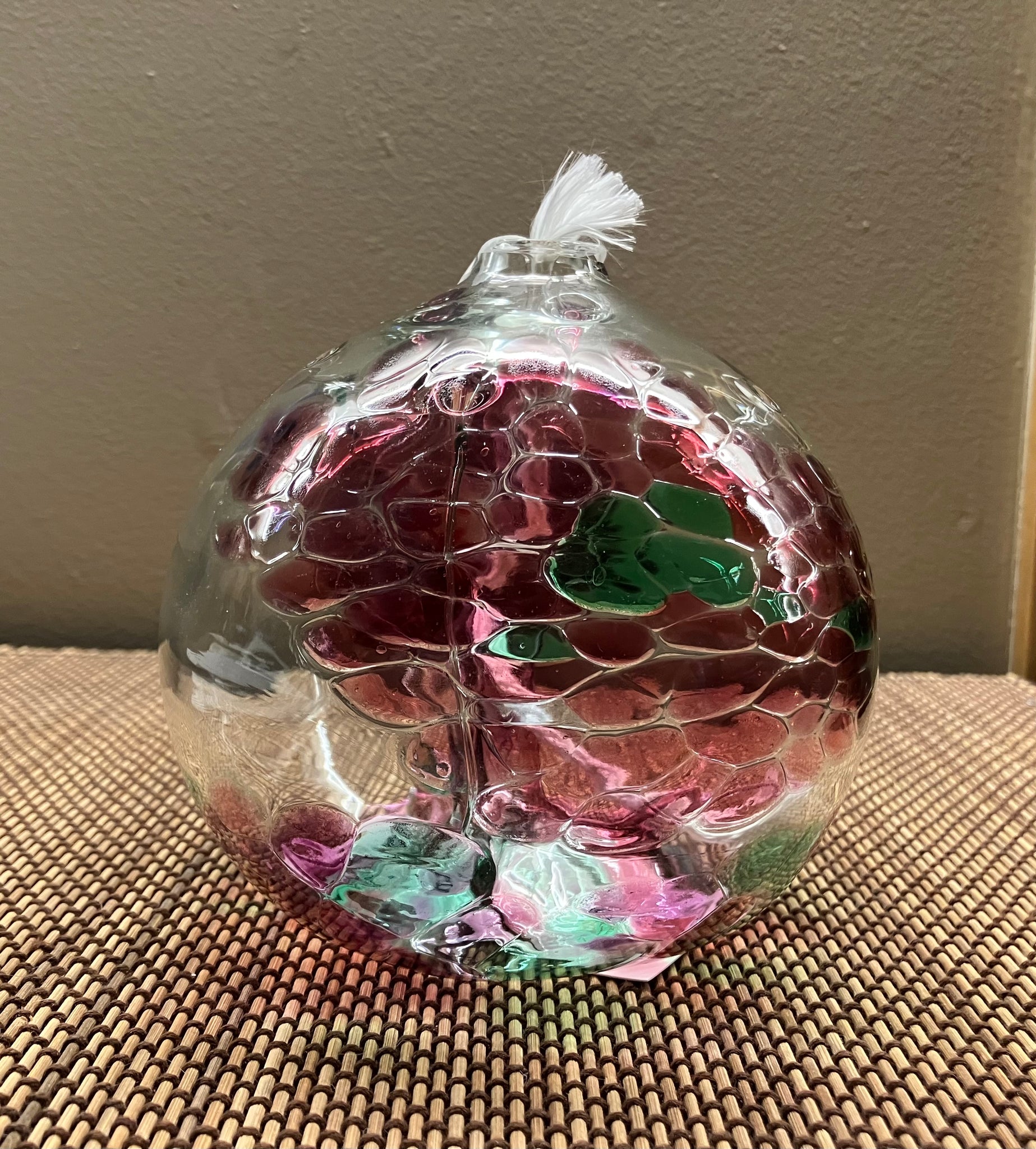 This gorgeous Kitras art glass oil lamp was done in the spirit ball pattern. It has beautiful strands within the ball. Fill this beauty with oil, light the lamp and enjoy